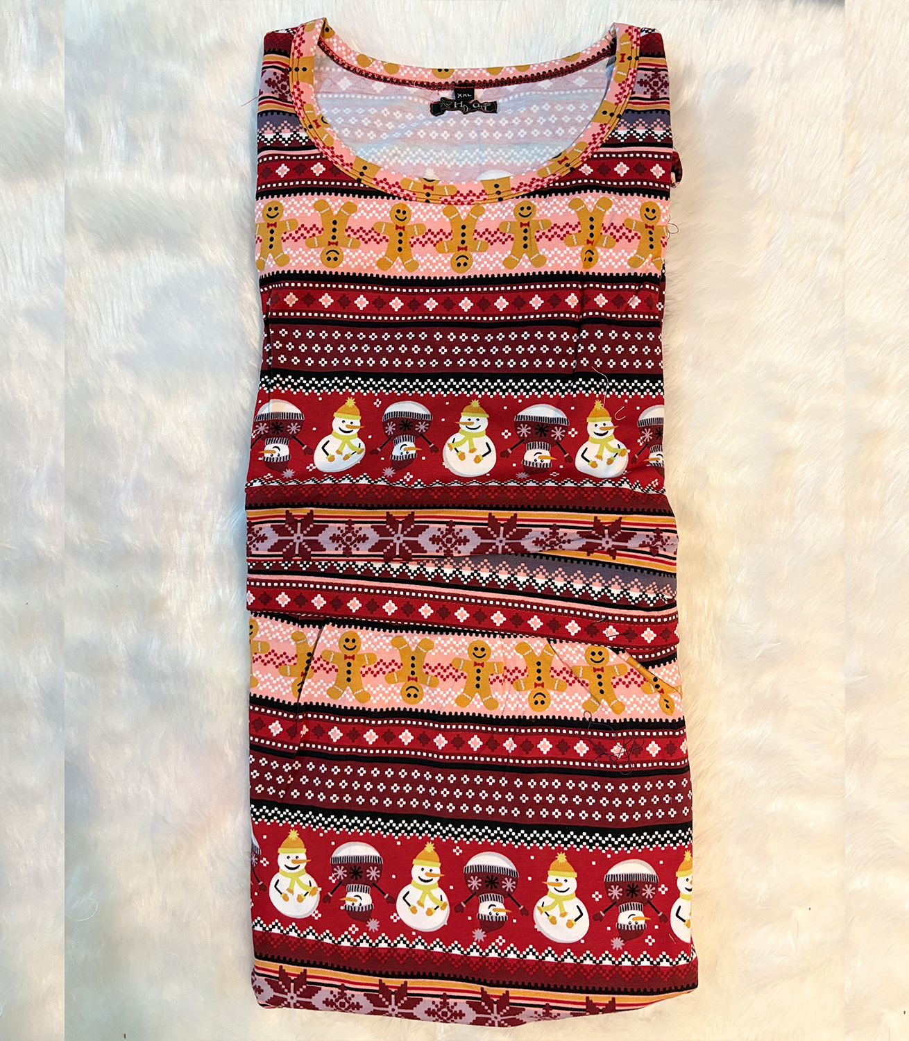 ⛄ Featuring playful patterns of gingerbread men, snowmen, and classic winter knits in cheerful red, white, and golden tones, this dress wraps you in the spirit of celebration.