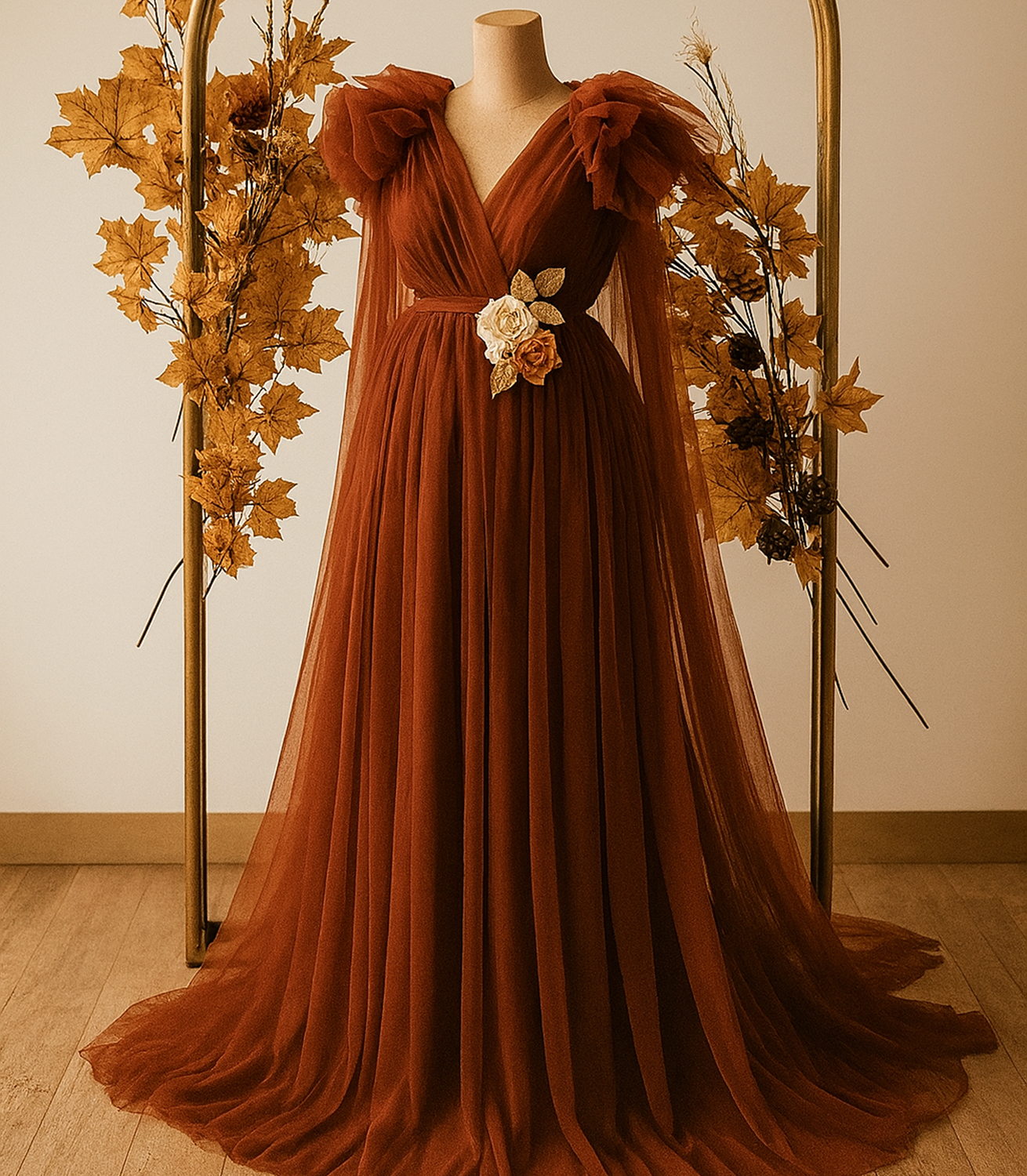 ❤️ Featuring delicate netted fabric in a rich honey brown shade, this gown gracefully complements your silhouette for maternity shoots, evening events, and special occasions.