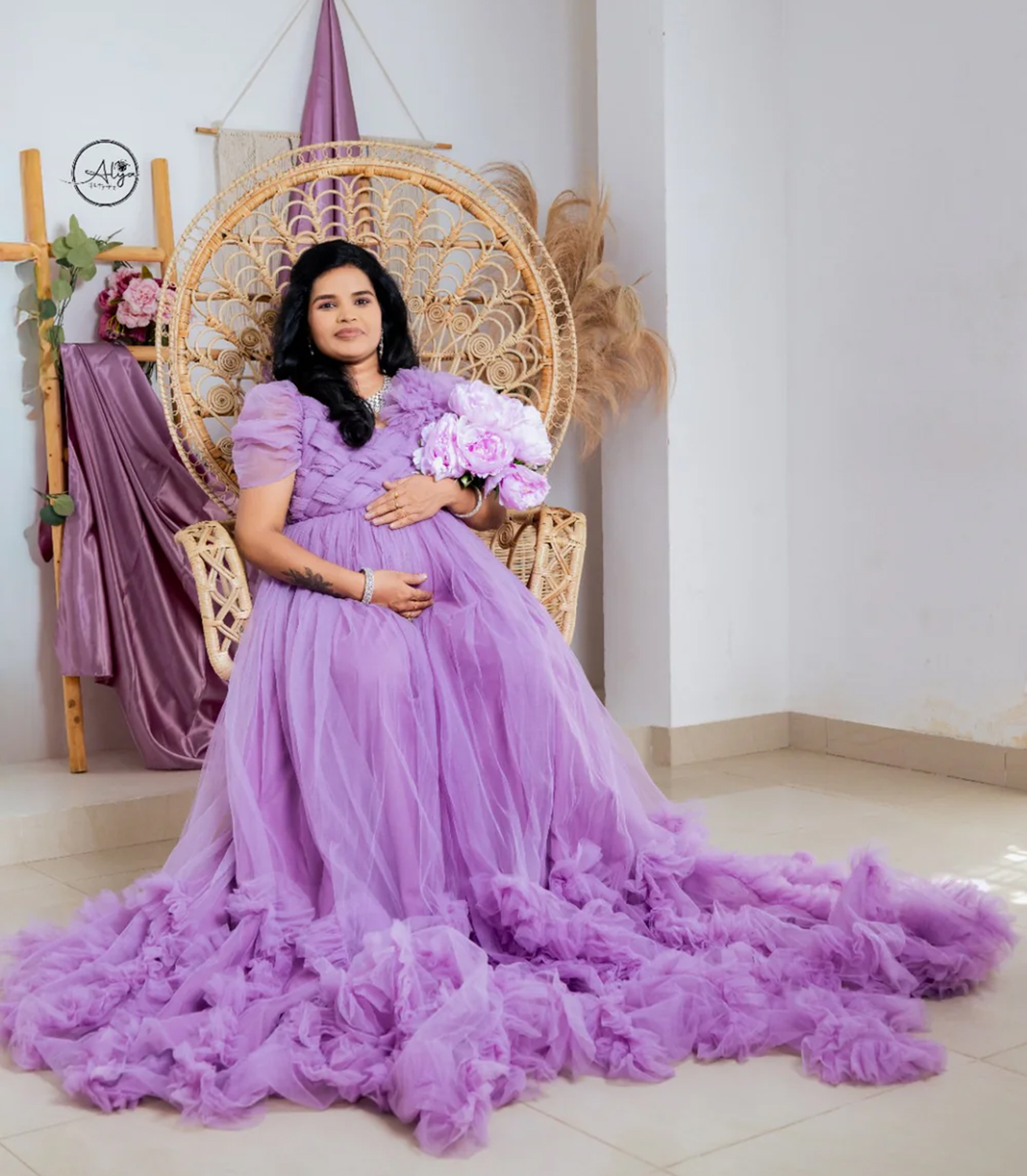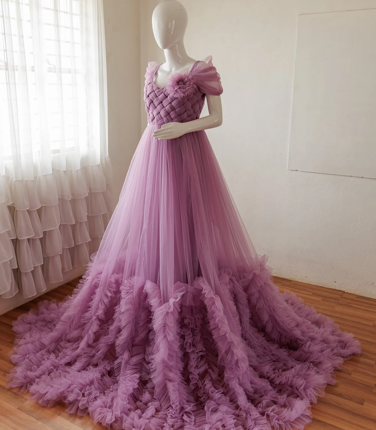 Looking for a dreamy ruffled gown for rent in Chennai? The Lilac Ruffled Gown is a showstopper — perfect for bridal shoots, baby showers, or fashion-forward photoshoots.